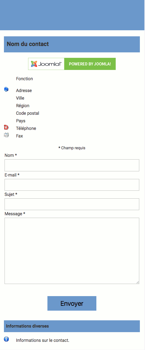 On voit donc qu'il faut se limiter à des choses simples, comme un formulaire de recherche par exemple. Néanmoins il est possible d'utiliser la fiche de contact de Joomla! et son formulaire d'envoi d'email.